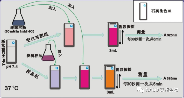 鄰苯三酚在堿性條件下能迅速發生氧化鏈式反應,釋放出超氧陰離子自由基(O2—),O2—進一步加速鄰苯三酚的氧化,生成在320 nm 處有特殊吸收的中間產物。若在反應體系中加入抗氧化物,可清除O2—,阻止中間產物的積累,使得在320 nm處的吸光度減小。