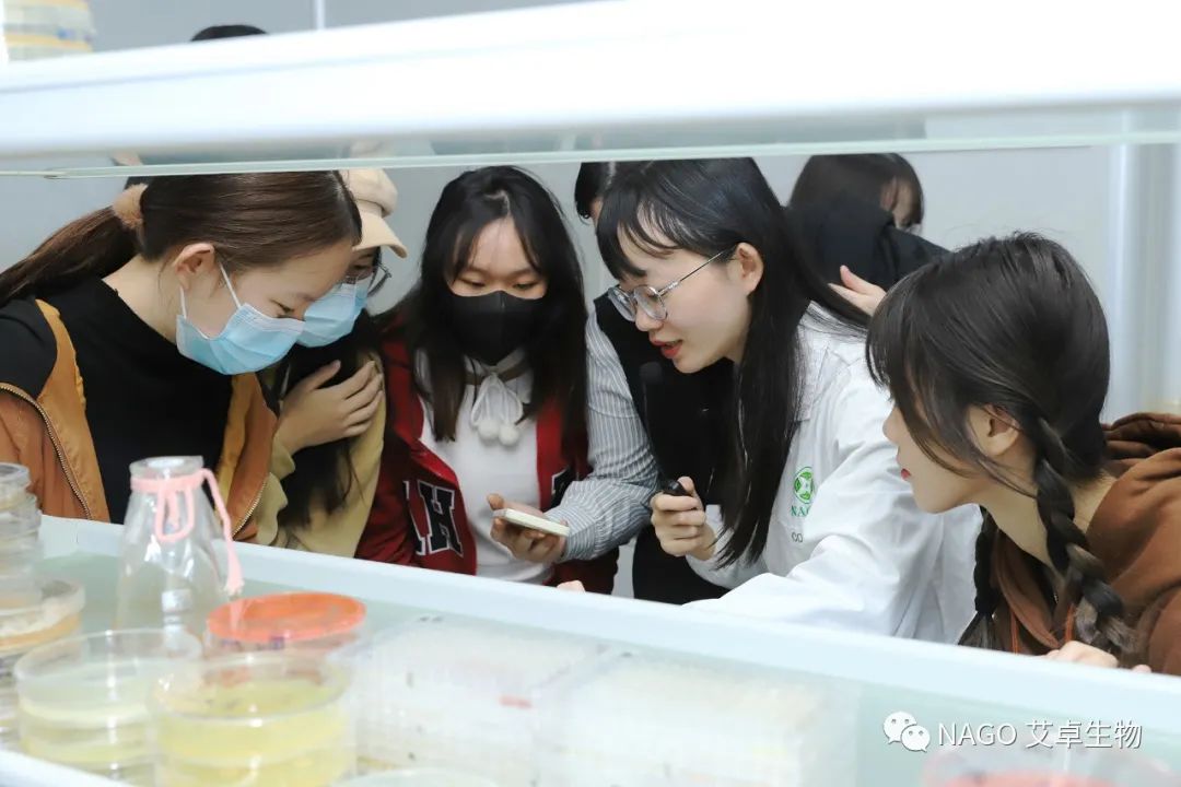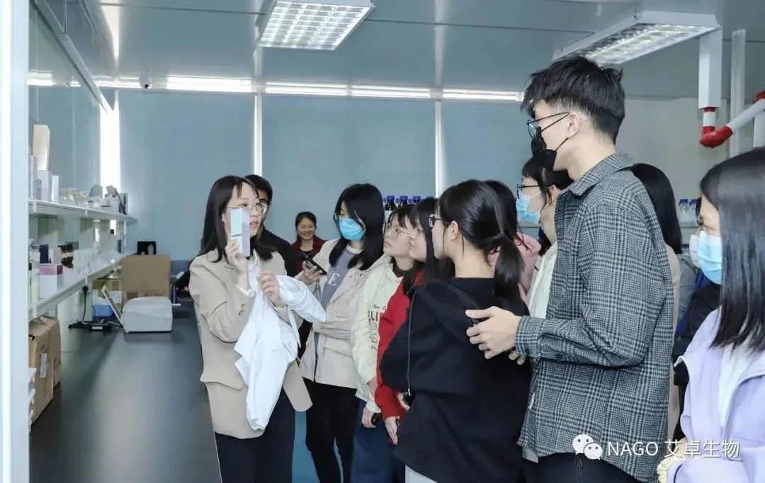 艾卓生物分析中心冼主任和技術支持周曉婷帶領肇慶學院師生參觀艾卓實驗室,讓大家了解產品的研發、應用、產品質控、功效評價以及微生物領域相關知識。